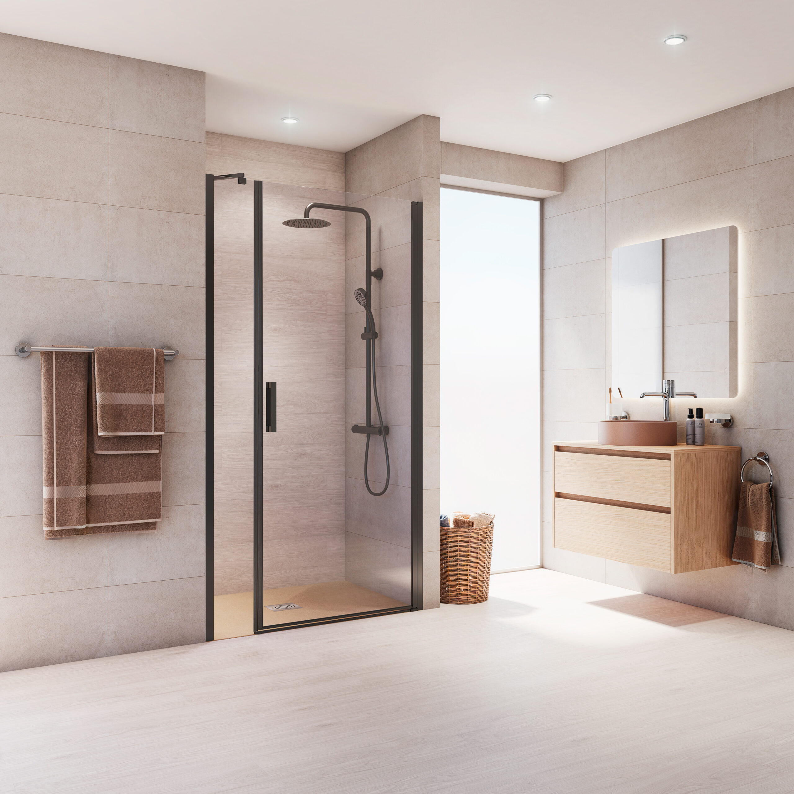 Mampara frontal abatible de una hoja abatible de 180º de apertura. Perfiles de aluminio con soporte de fijación de acero. Acabados plata brillo y negro mate en stock y disponible bajo pedido en acabados Inox cepillado y blanco mate que permiten la total combinación con los acabados de grifería. Cuenta con tratamiento easy clean.