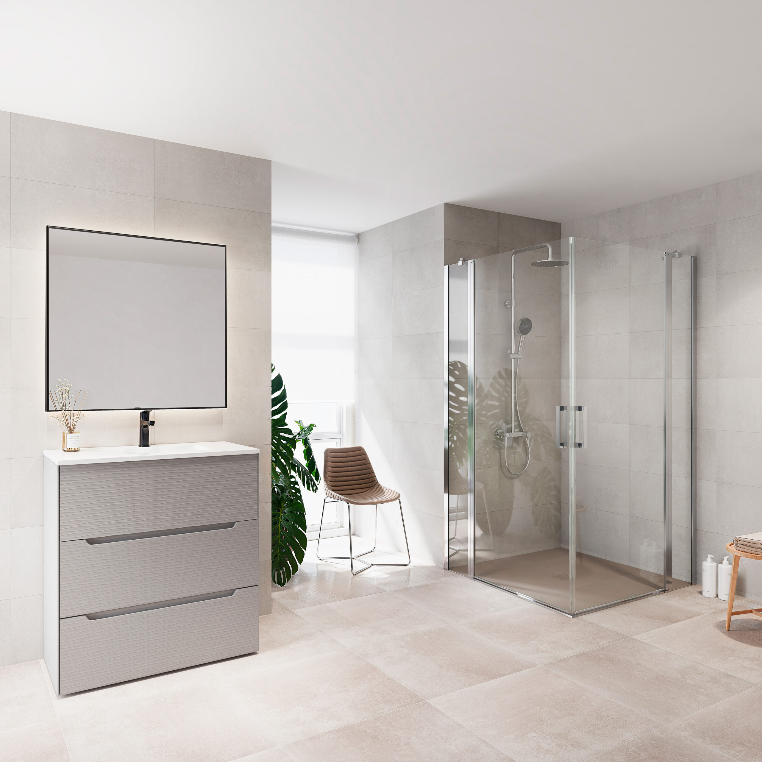 Mampara angular abatible de dos hojas abatibles + 2 hojas fijas de 180º de apertura. Perfiles de aluminio con soporte de fijación de acero. Acabados plata brillo y negro mate en stock y disponible bajo pedido en acabados Inox cepillado y blanco mate que permiten la total combinación con los acabados de grifería. Cuenta con tratamiento easy clean.