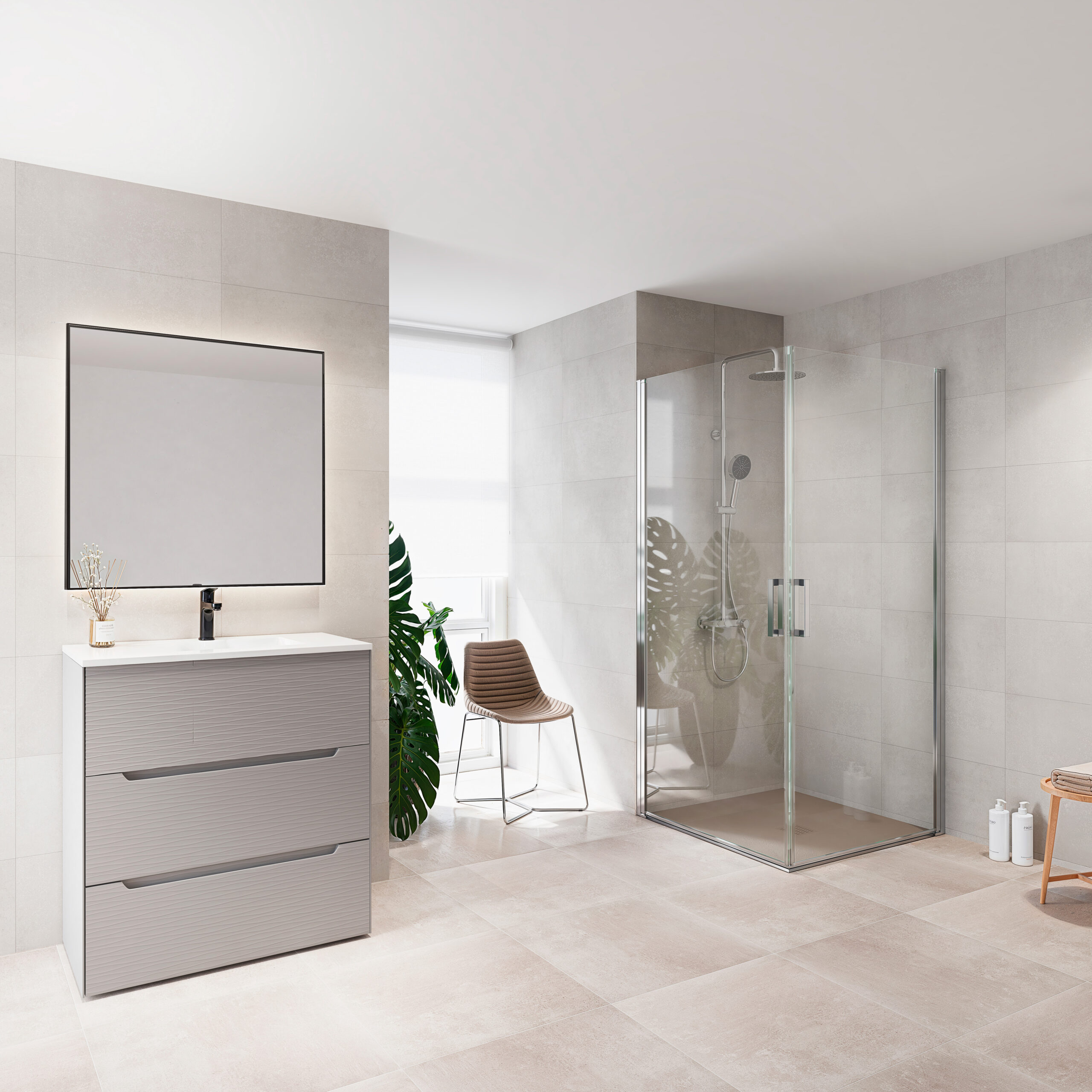 Mampara angular abatible de dos hojas abatibles de 180º de apertura. Perfiles de aluminio con soporte de fijación de acero. Acabados plata brillo y negro mate en stock y disponible bajo pedido en acabados Inox cepillado y blanco mate que permiten la total combinación con los acabados de grifería. Cuenta con tratamiento easy clean.