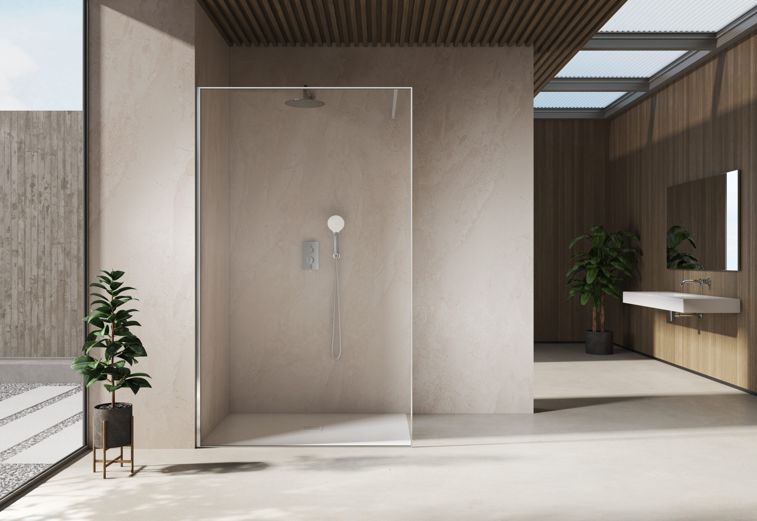 Mampara con perfilería ultra fina de 8x20 mm y tirante minimalista de aluminio de 1.200 mm. Permite obtener distintas configuraciones combinando fijos con los conectores disponibles. Consultar ficha técnica.